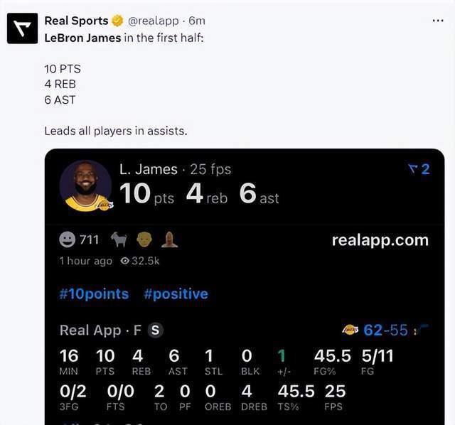 第二節(jié)又是8投4中,得到8分4籃板5助攻填滿數(shù)據欄。半場打完,詹姆斯的數(shù)據是11投5中10分6助攻4籃板1搶斷。