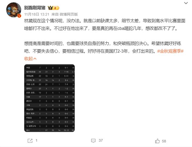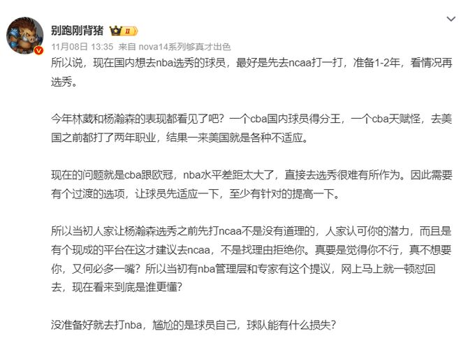 媒體人別跑剛背豬炮轟林葳、楊瀚森,一個CBA國內(nèi)得分王,一個CBA天賦怪,去NBA前都打了兩年CBA結(jié)果到了美國就各種不適應(yīng),現(xiàn)在CBA跟歐冠、NBA水平差太大了。