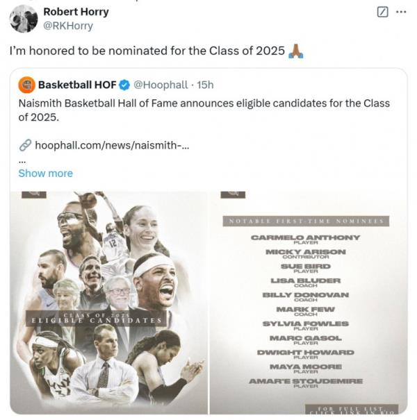 其中,七冠成員羅伯特-霍里在列。對(duì)此,他轉(zhuǎn)推評(píng)論道:“我很榮幸能夠提名2025屆奈史密斯名人堂?!?/p>
