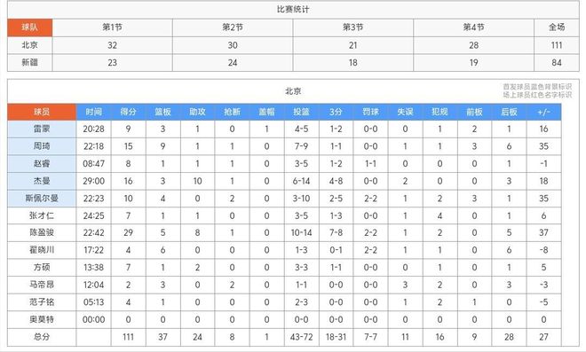 作為CBA的兩支傳統(tǒng)強隊,北京vs新疆的比賽結果令人意外,兩人沒有進行所謂的拉鋸戰(zhàn),而是上半場就奠定了比賽的局勢。第一節(jié),北京男籃在趙睿和周琦這兩位前新疆球員的帶領下,以32:23領先9分,第二節(jié),隨著陳盈駿的爆發(fā),分差進一步被拉開至15分。下半場盡管新疆男籃力求追分,但這賽季的北京陣容深度雄厚,絲毫沒給新疆機會,球隊最終以111:84贏下比賽。