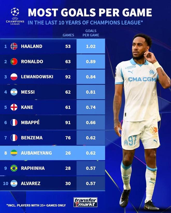 北京時間11月26日,德轉統(tǒng)計出了近10年歐冠場均進球數(shù)排名前10的球員,哈蘭德以場均1.02球高居第一,C羅0.89球第二,梅西0.81球第四,在本輪歐冠比賽中完成梅開二度的奧巴梅揚以0.62球位列第八位。