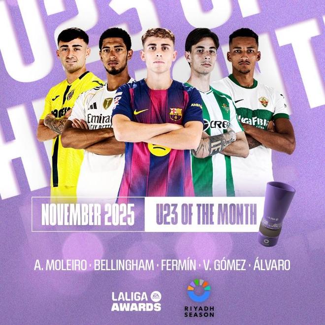 北京時(shí)間11月27日,西甲官方公布了聯(lián)賽11月最佳U23球員的5位候選者,費(fèi)爾明-洛佩斯和貝林厄姆在列。