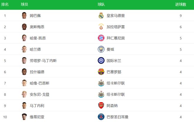 姆巴佩打進(jìn)4球,直接導(dǎo)致歐冠射手榜大變,姆巴佩以9粒進(jìn)球升上射手榜第1的位置。這也是姆巴佩職業(yè)生涯在單屆歐冠最多的一次。奧斯梅恩以6粒進(jìn)球排名第2。姆巴佩的兩個(gè)非常強(qiáng)大的競(jìng)爭(zhēng)對(duì)手哈蘭德和凱恩在這一輪都沒(méi)有進(jìn)球,都被姆巴佩甩開(kāi)了。